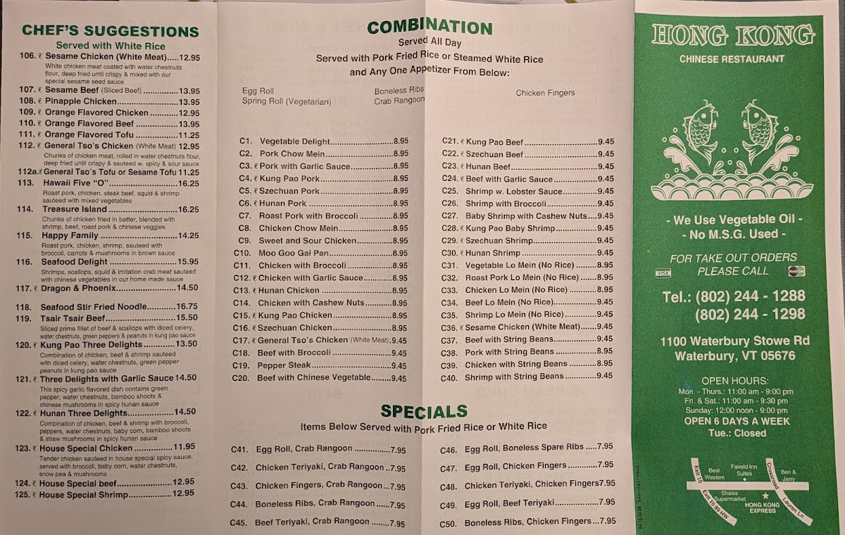 Welcome to Hong Kong Chinese Restaurant Waterbury, a hidden gem nestled at 1100 Waterbury-Stowe Rd, Vermont. This family-owned eatery combines warm hospitality with a diverse menu that captures the essence of authentic Chinese cuisine.